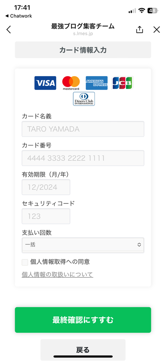 カード情報、支払い回数などを入力し送信していただくと自動返信メッセージがLINEに届きますので、そちらをご確認ください。
